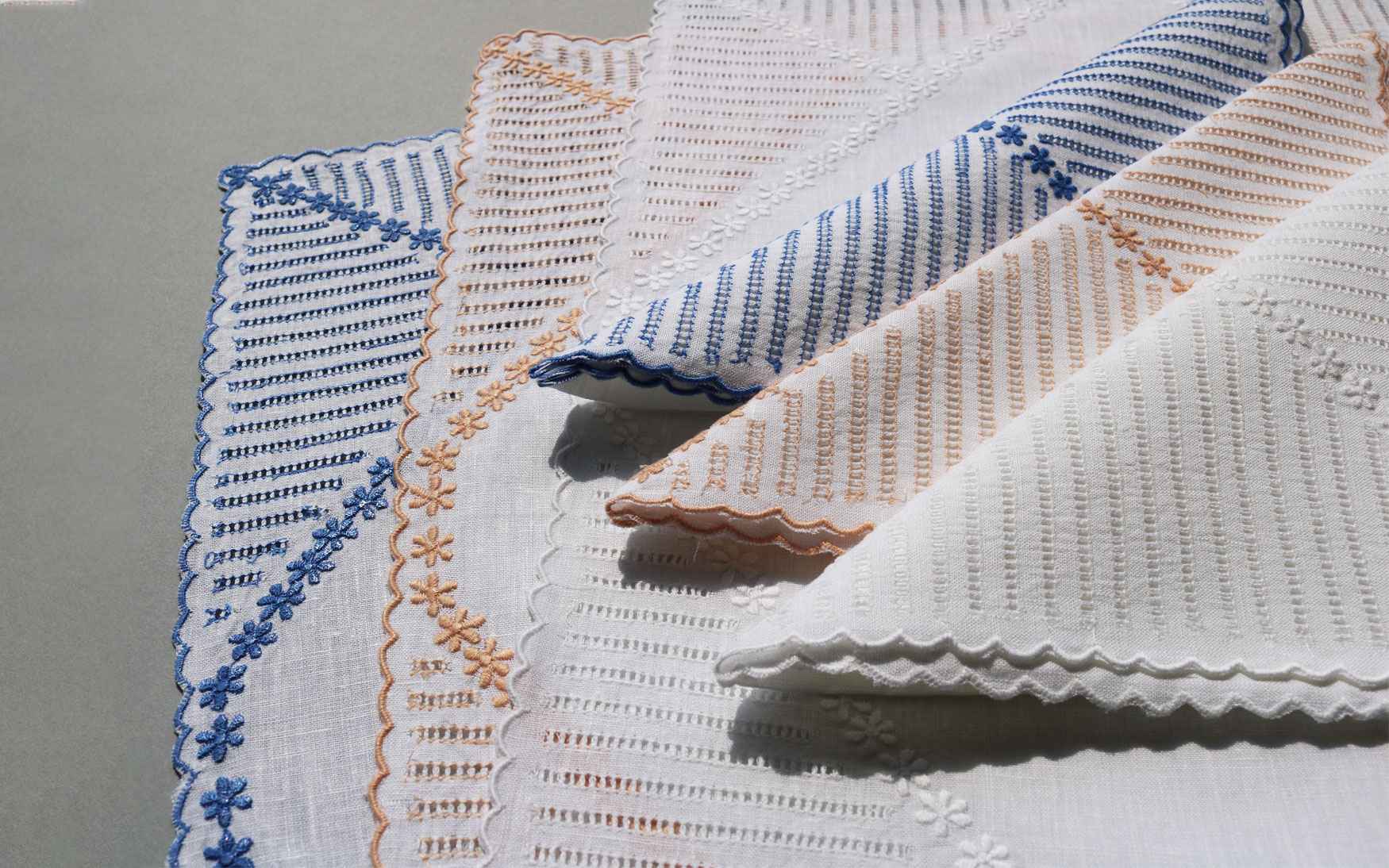 These linen placemats & napkins are framed with scalloped edge embroidery border.