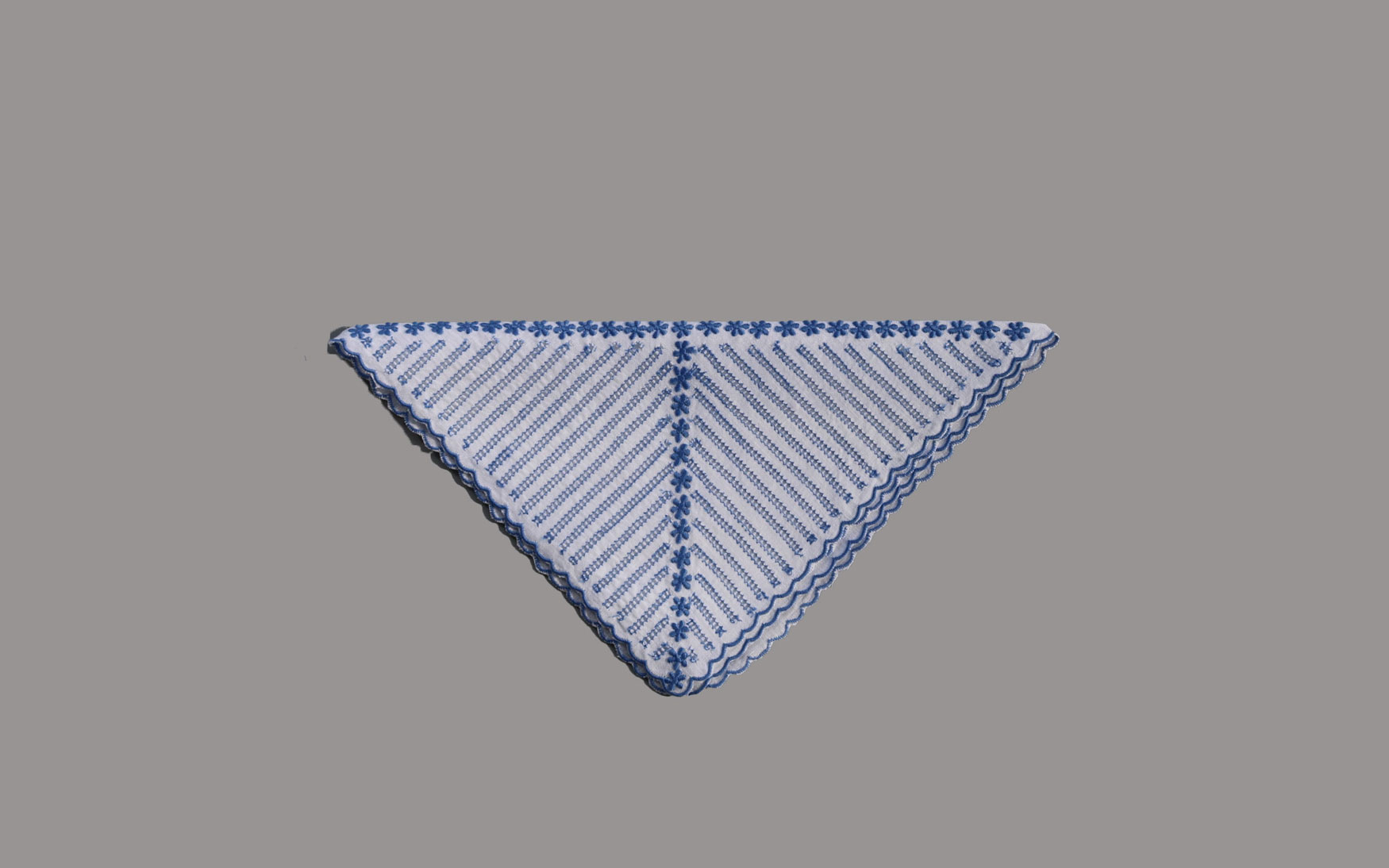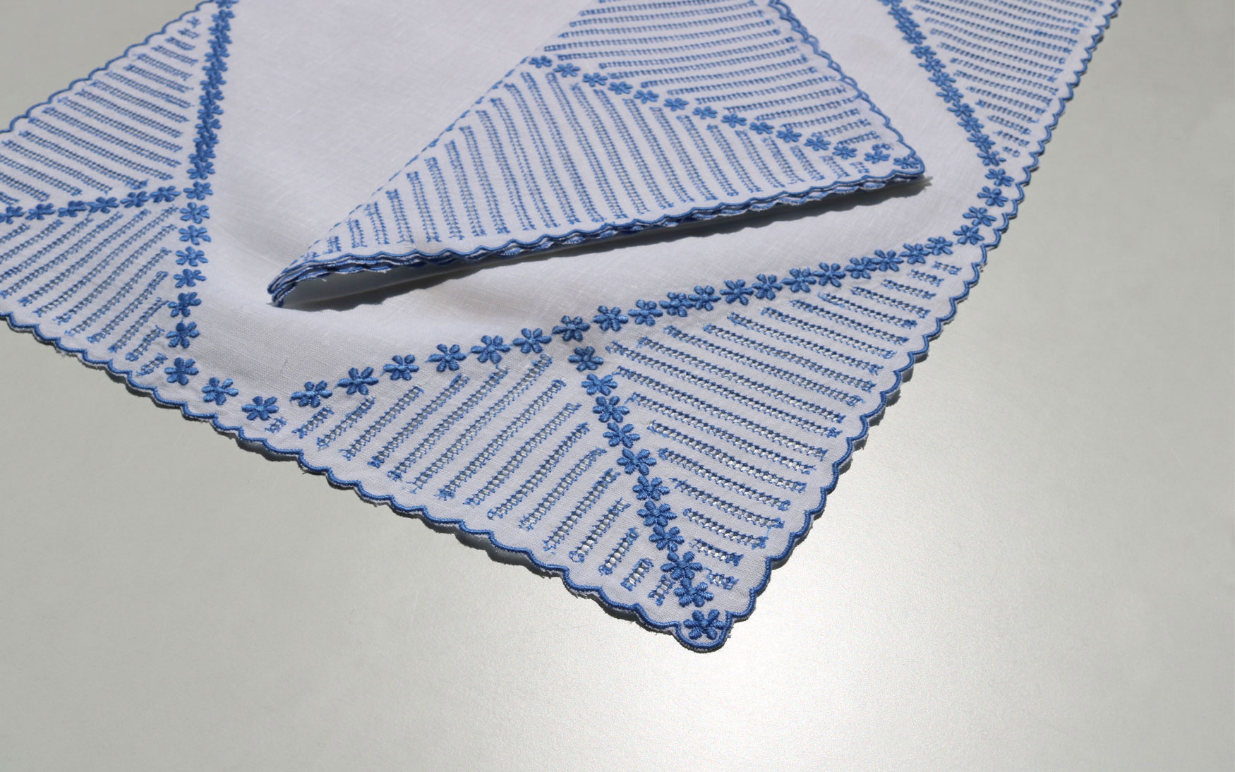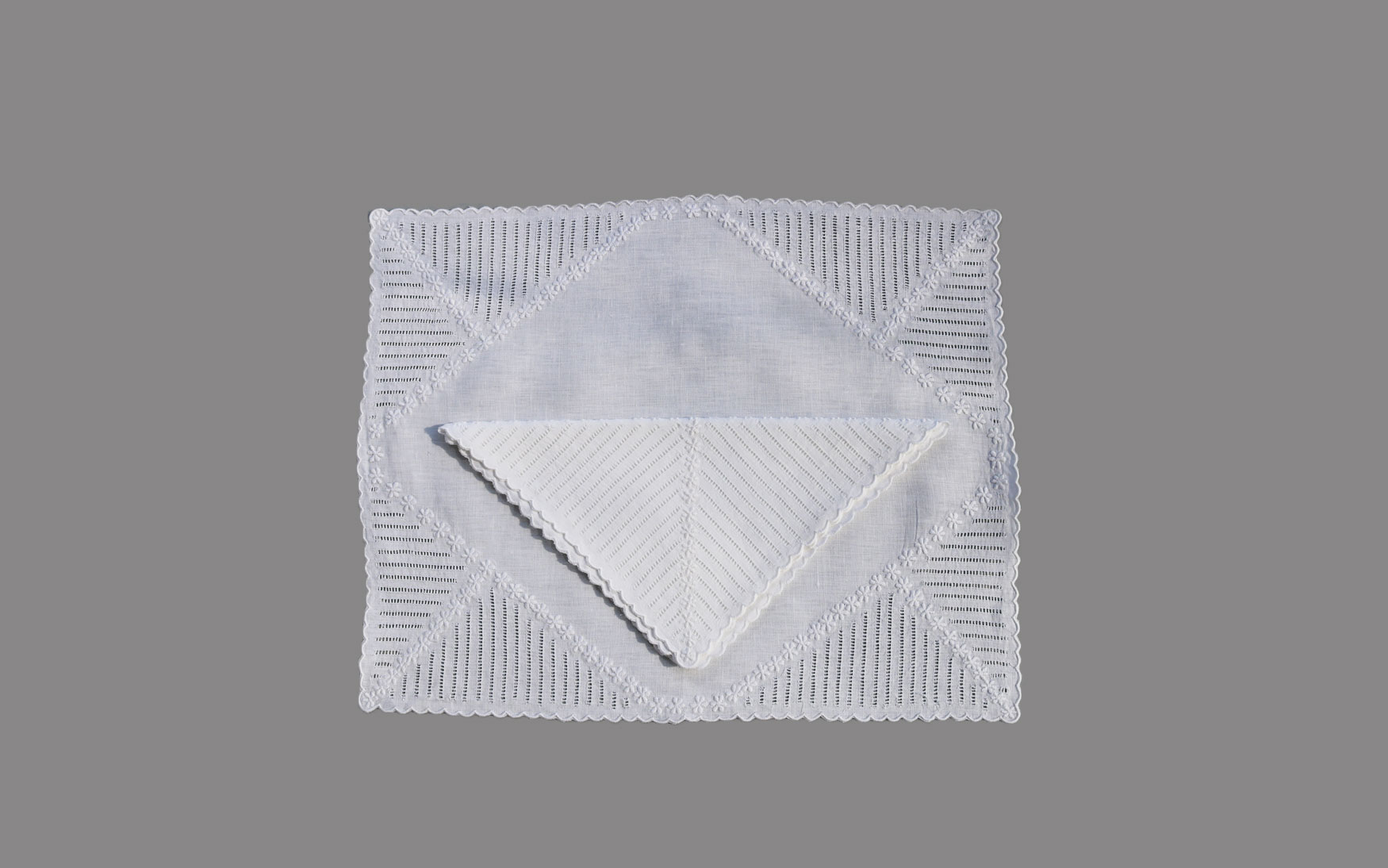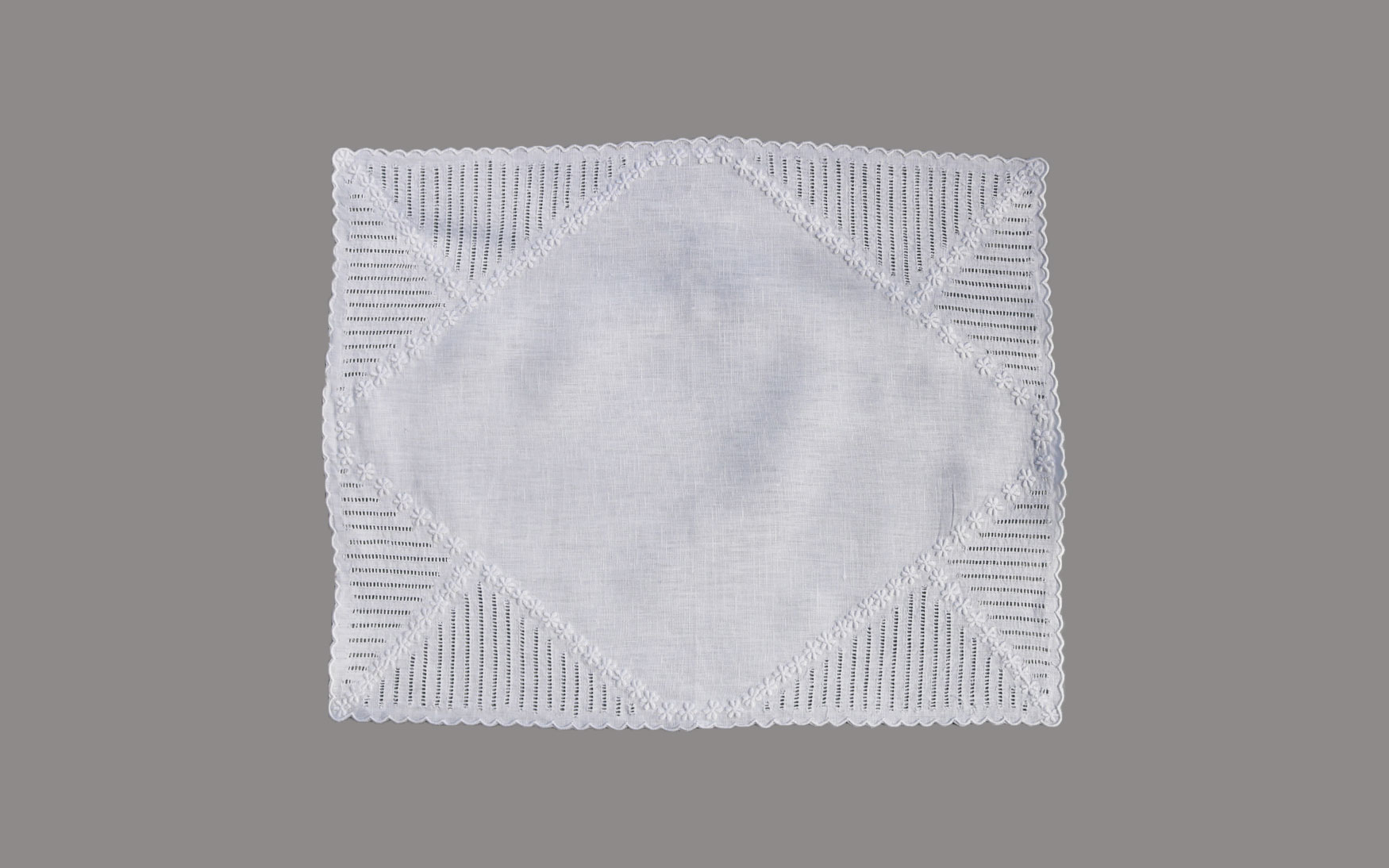 This unique ajour and flower design is embroidered on white linen.