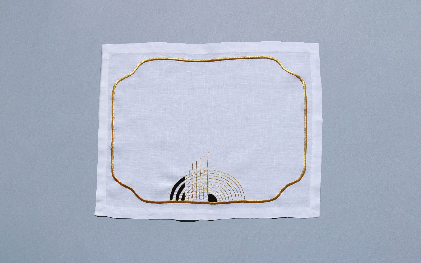 A beautiful gold and black geometric design machine embroidery on white linen with golden line border.