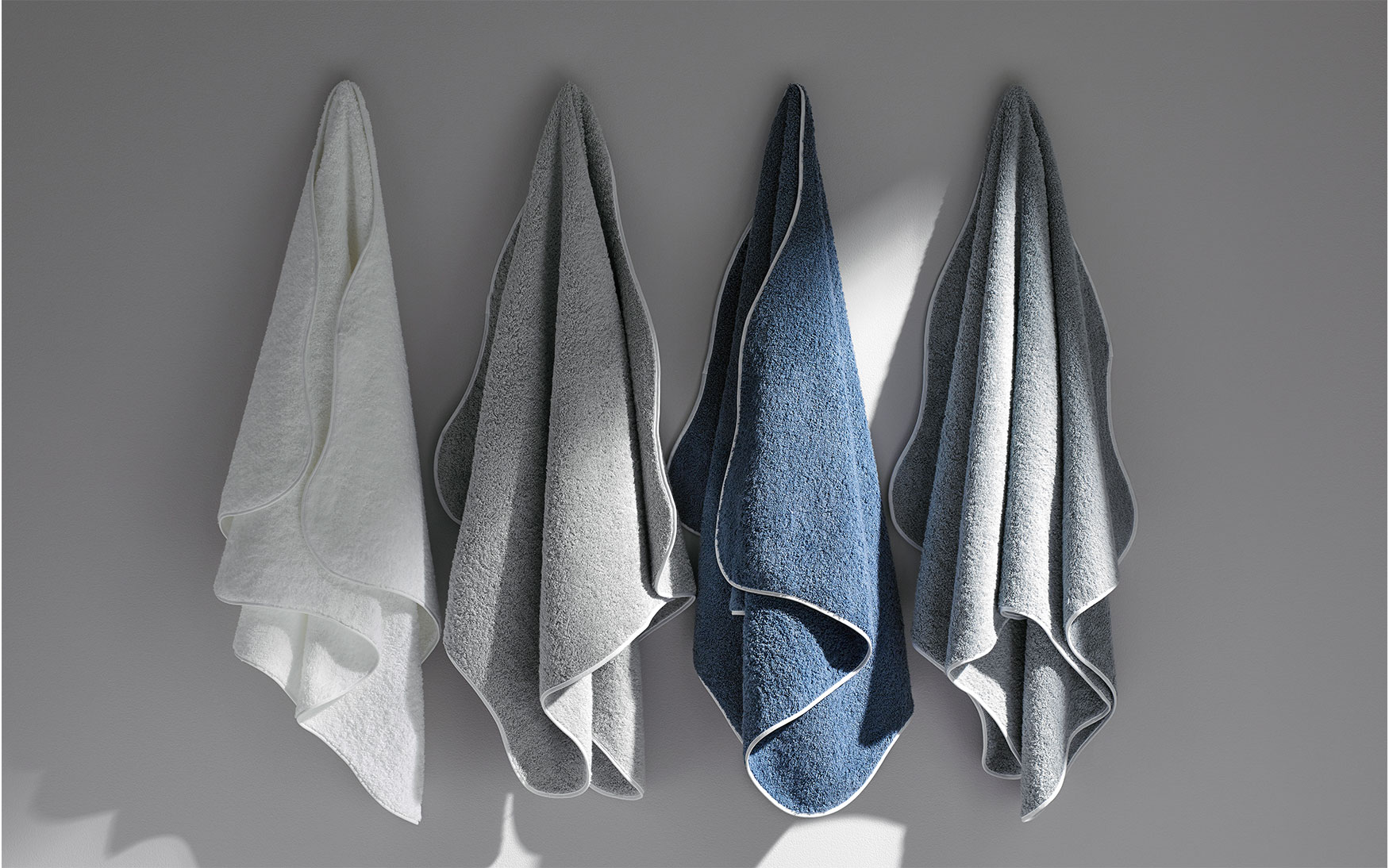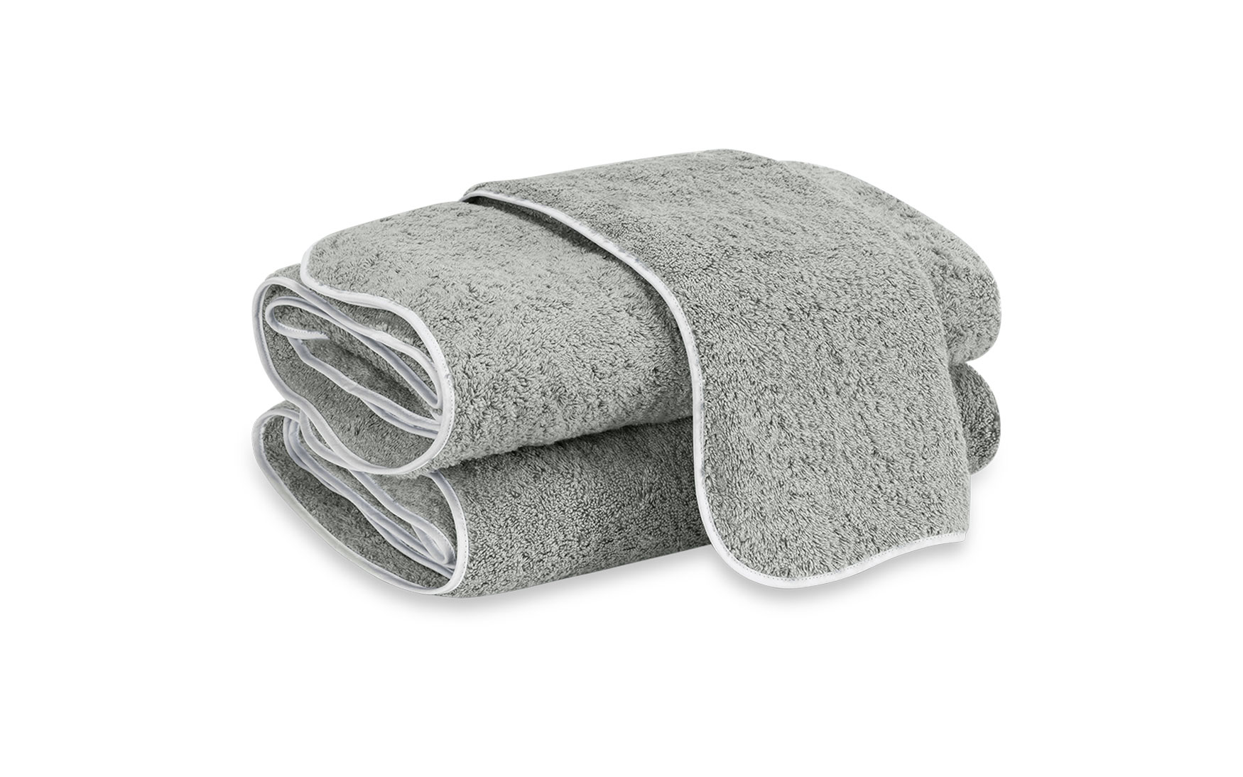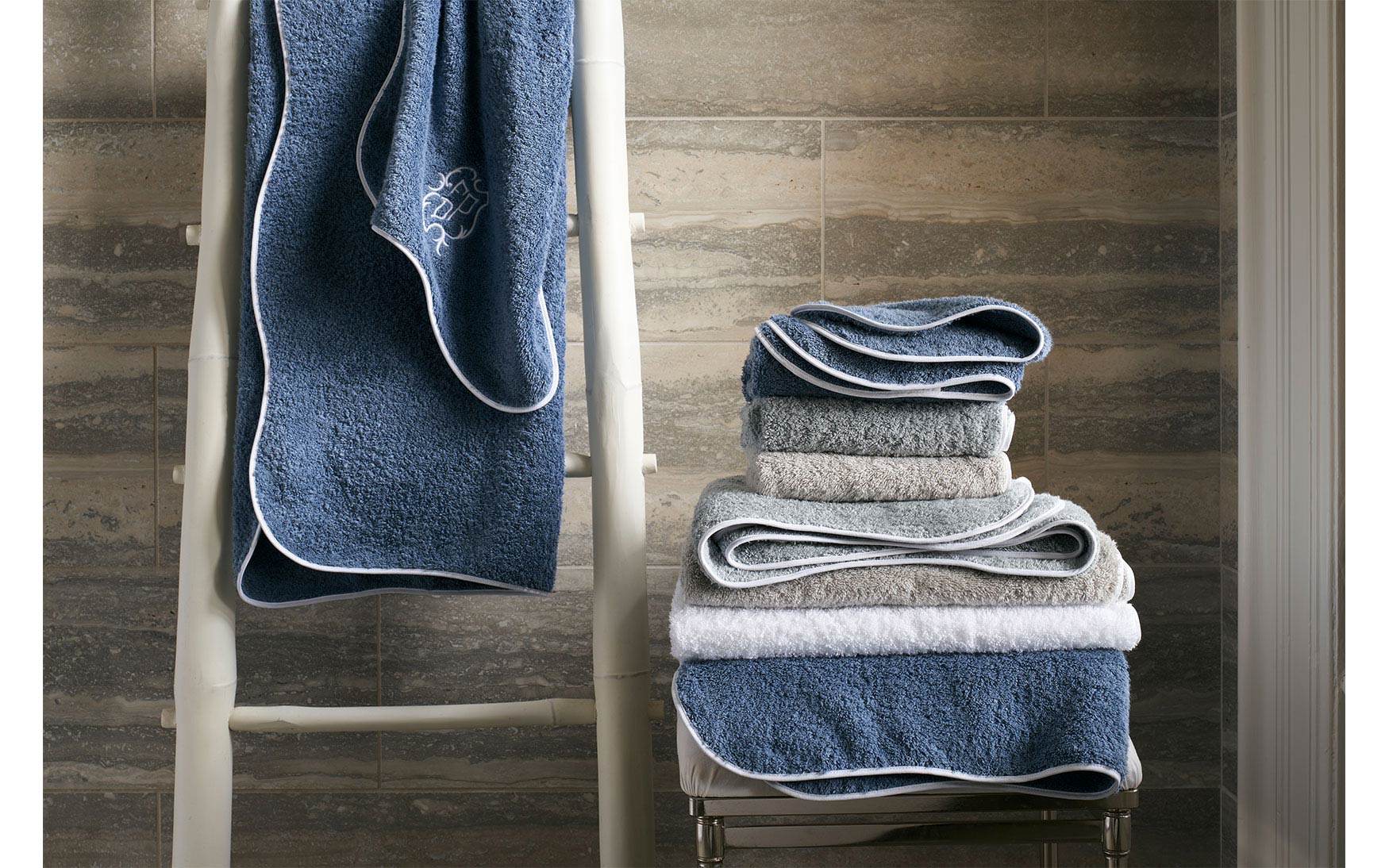 This variation of our popular Cairo towel retains its classic simplicity and its lush long-staple cotton terry. We've now given the edge a smooth subtle undulation trimmed with white tape, creating a lovely silhouette to display in your bath.