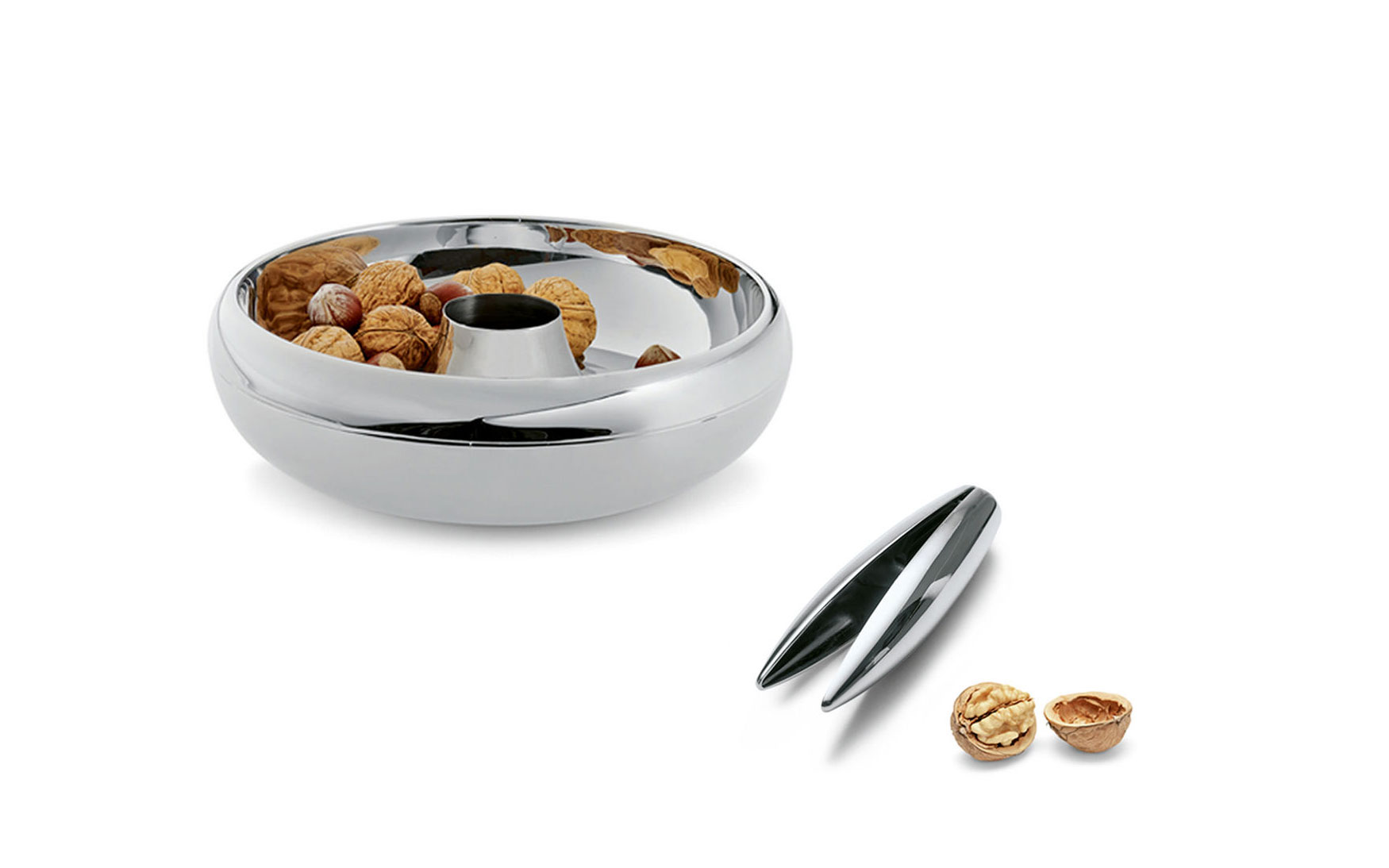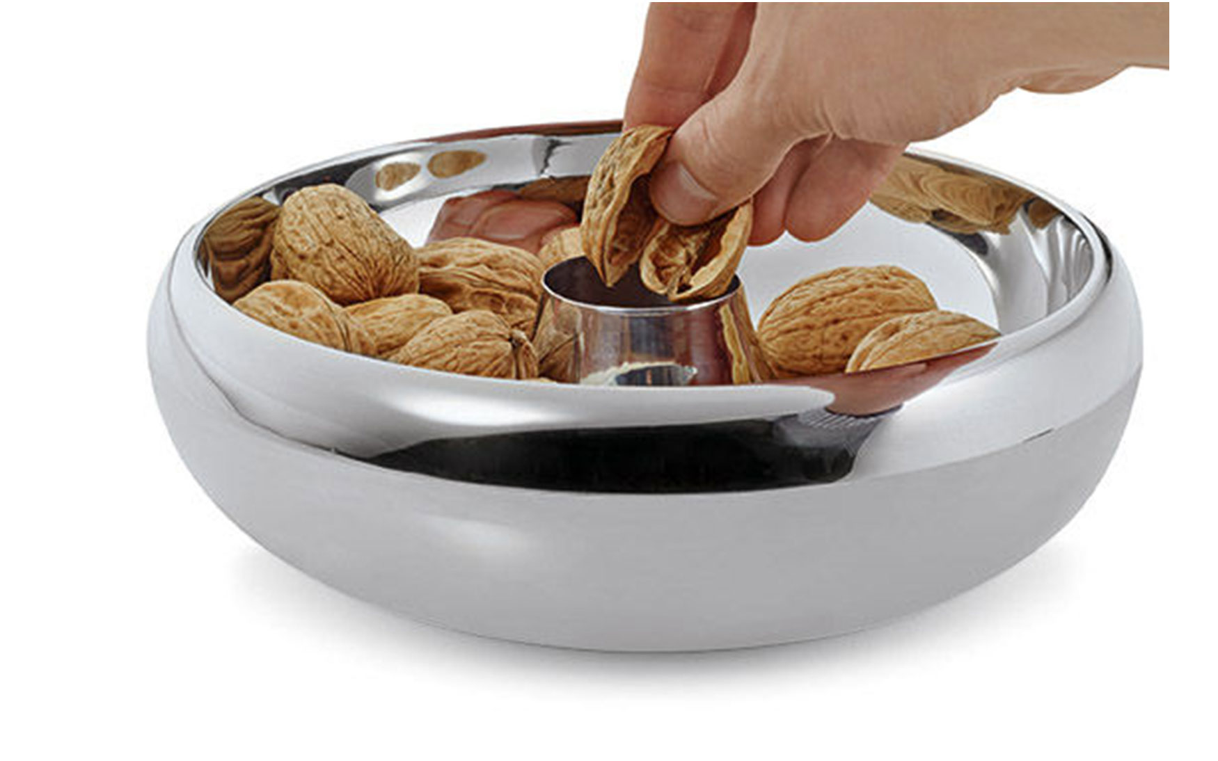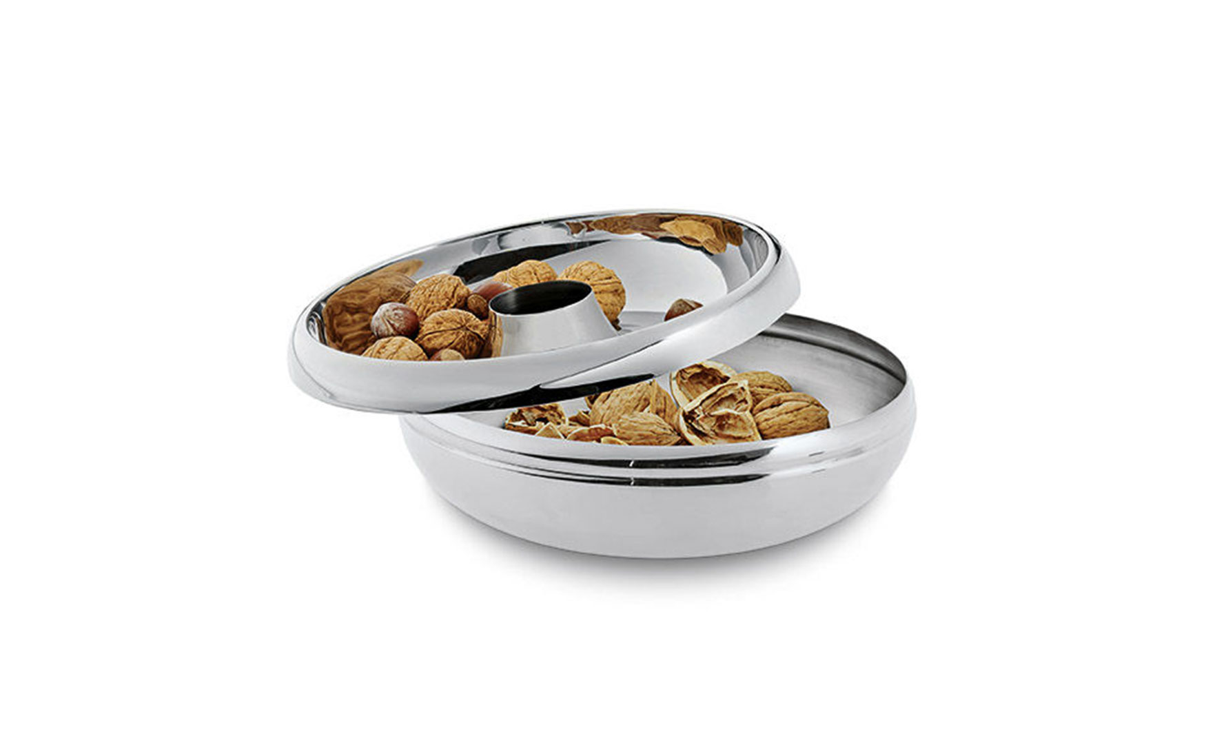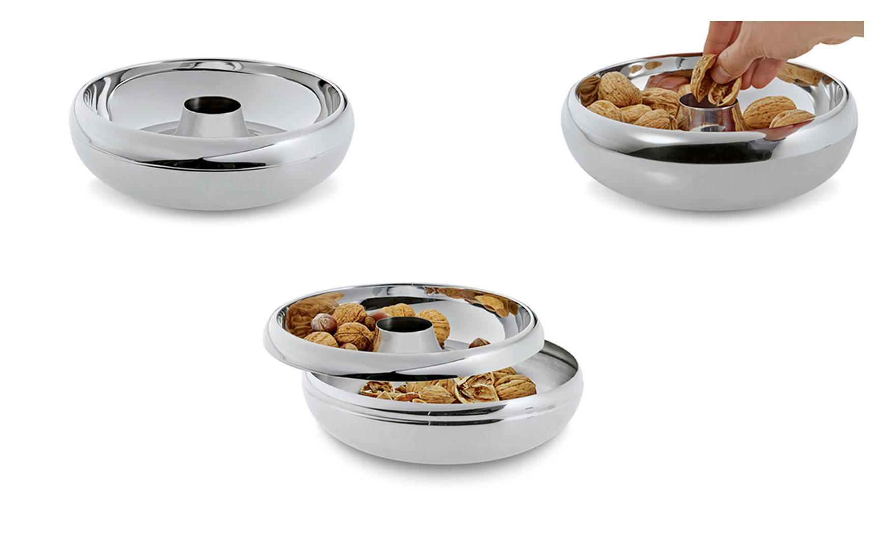 The bowl serves nuts, sweets and pralines on its upper ring. Empty nutshells and candy paper drops through the hole in the middle. The idea convinced the international jury and could win against a numerous competitive product.