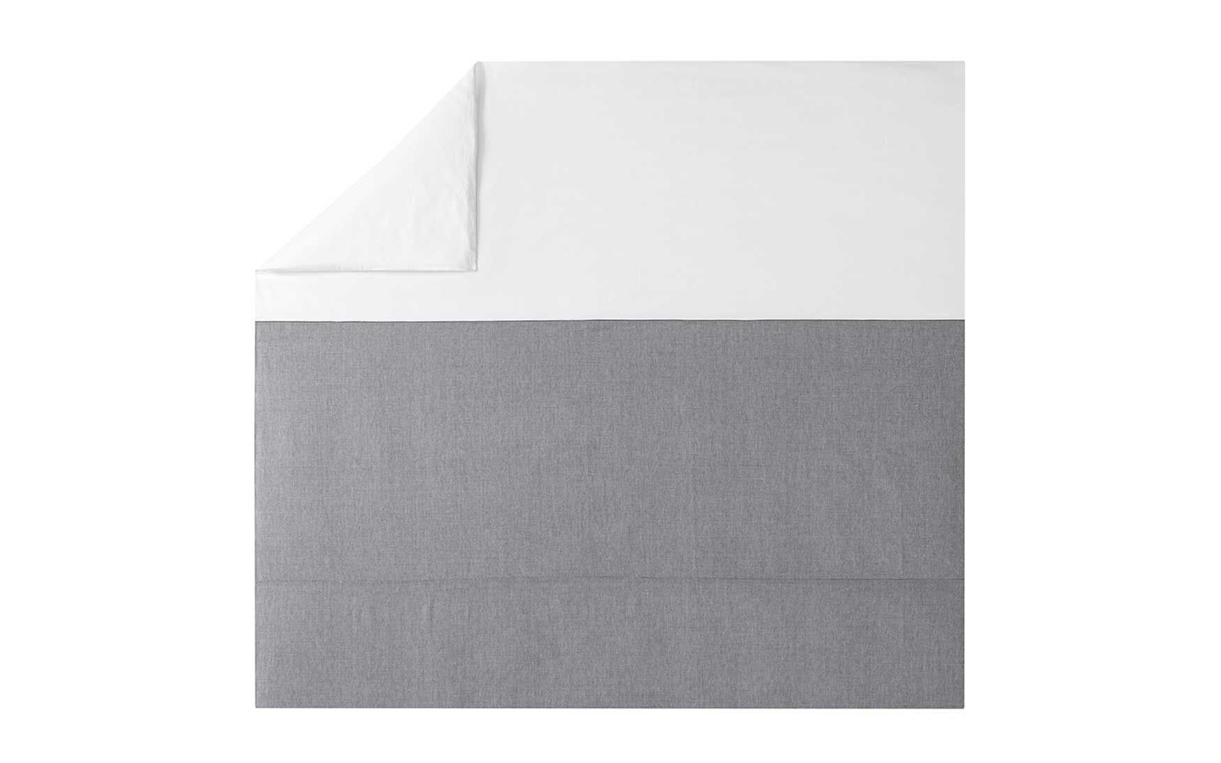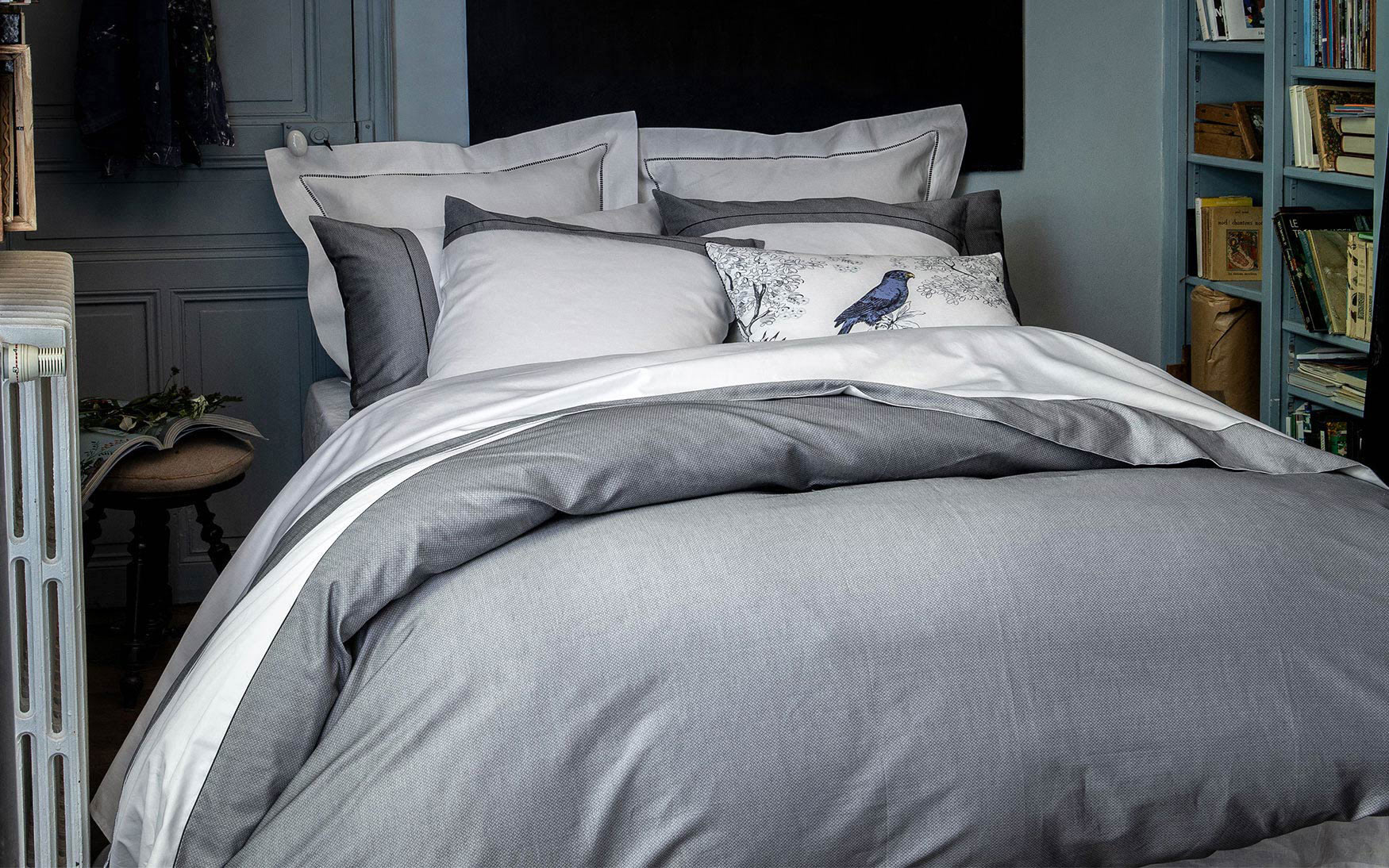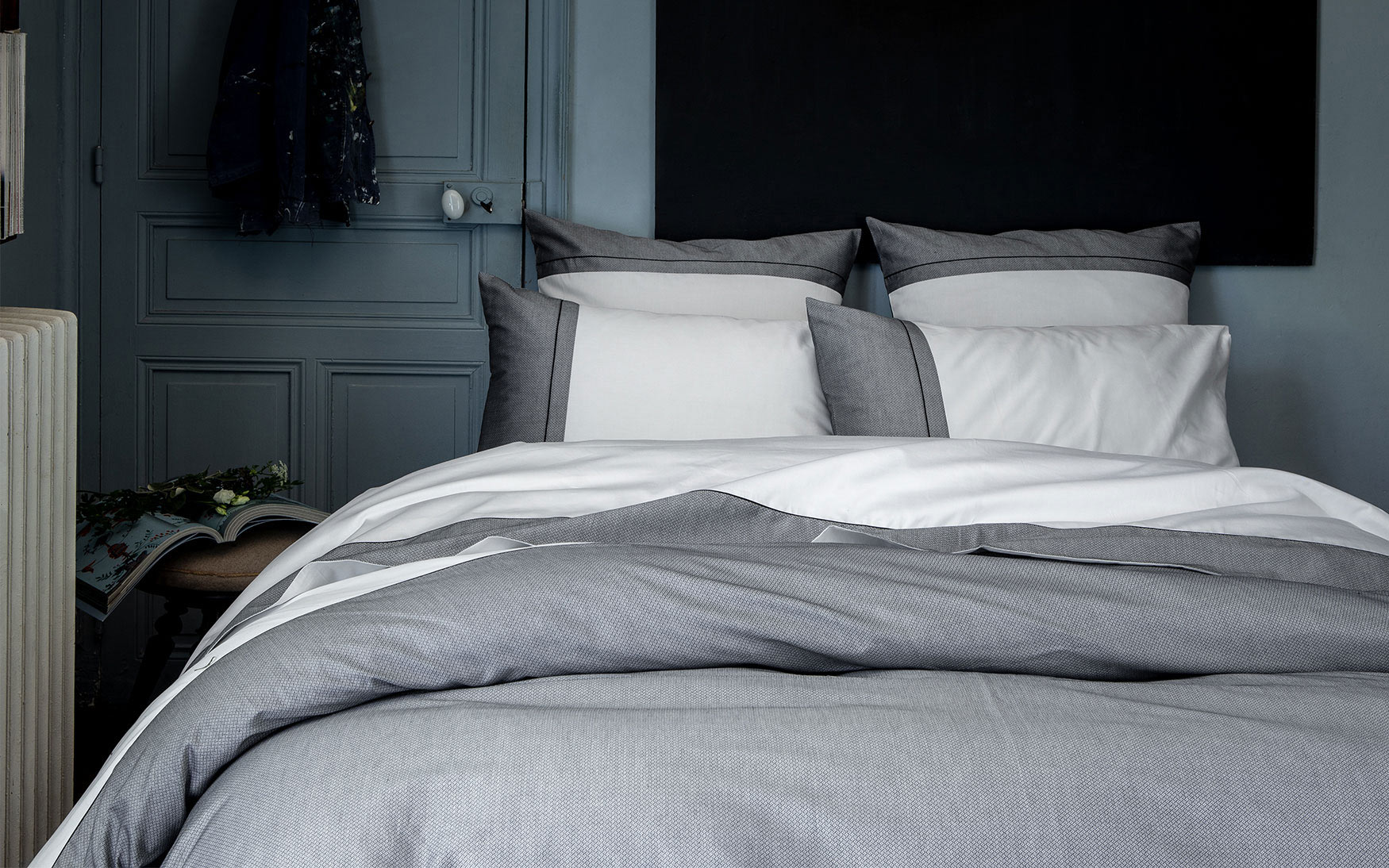 The inspiration for the GONCOURT duvet cover came from the male wardrobe with its micro dyed woven tie motif. The association between an ultrasoft and silky snow sateen and a micro pattern woven on a jacquard loom makes this bed linen model a simple and effective two-tone composition The appeal of this classic but modern style comes from the contrast of materials: the texture of Jacquard and silky sateen and the contrast of colors: the mottled navy blue of the pattern and the purity of white satin. You can complete this very modern bed set with the fitted sheet from the TEO collection in snow or navy colors.