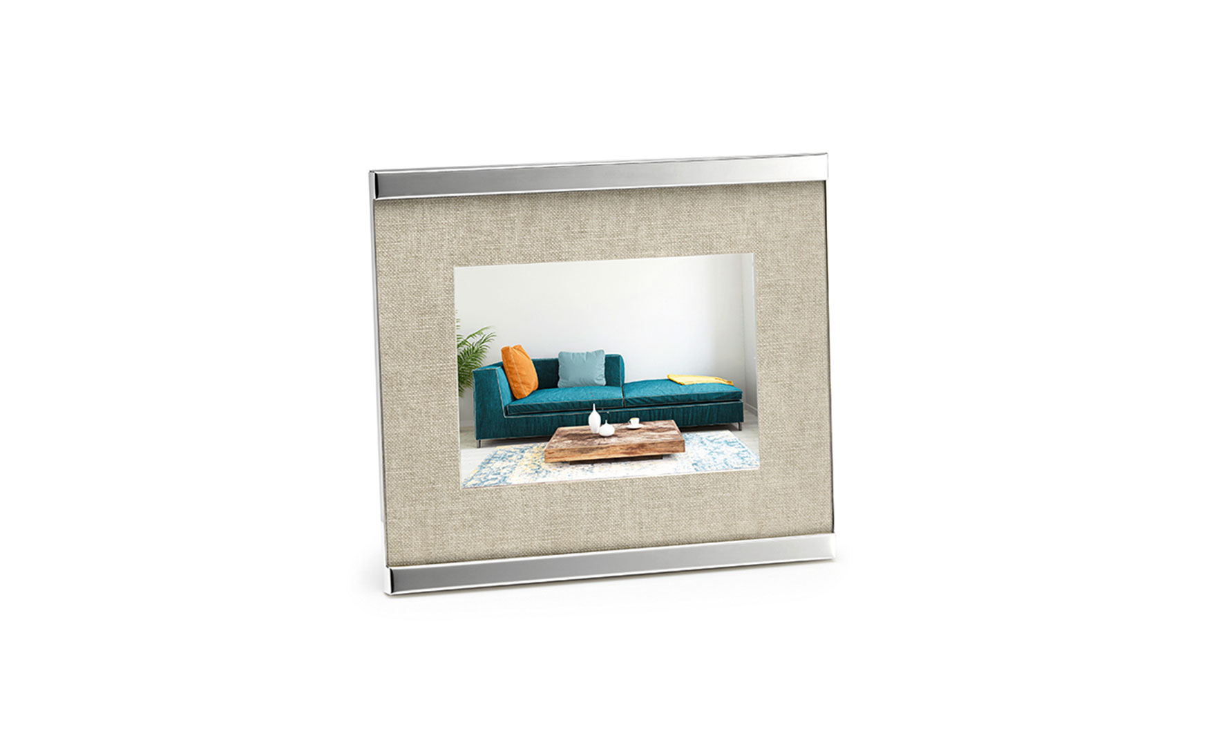 It always becomes exciting when rough, organic surfaces meet up with the coolness of bare metal. Two opposites that beautifully attract, come together to one harmonious unit in the HOME frame. The fine, uncolored linen structure that also takes over duty as a passé partout, meets up with high-polished nickel; this is used very sparingly and thus, underlines the modern, trend-oriented demand. No matter which picture, HOME includes a stylistically confident appearance.