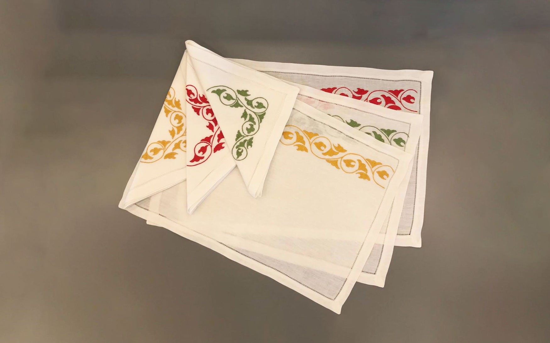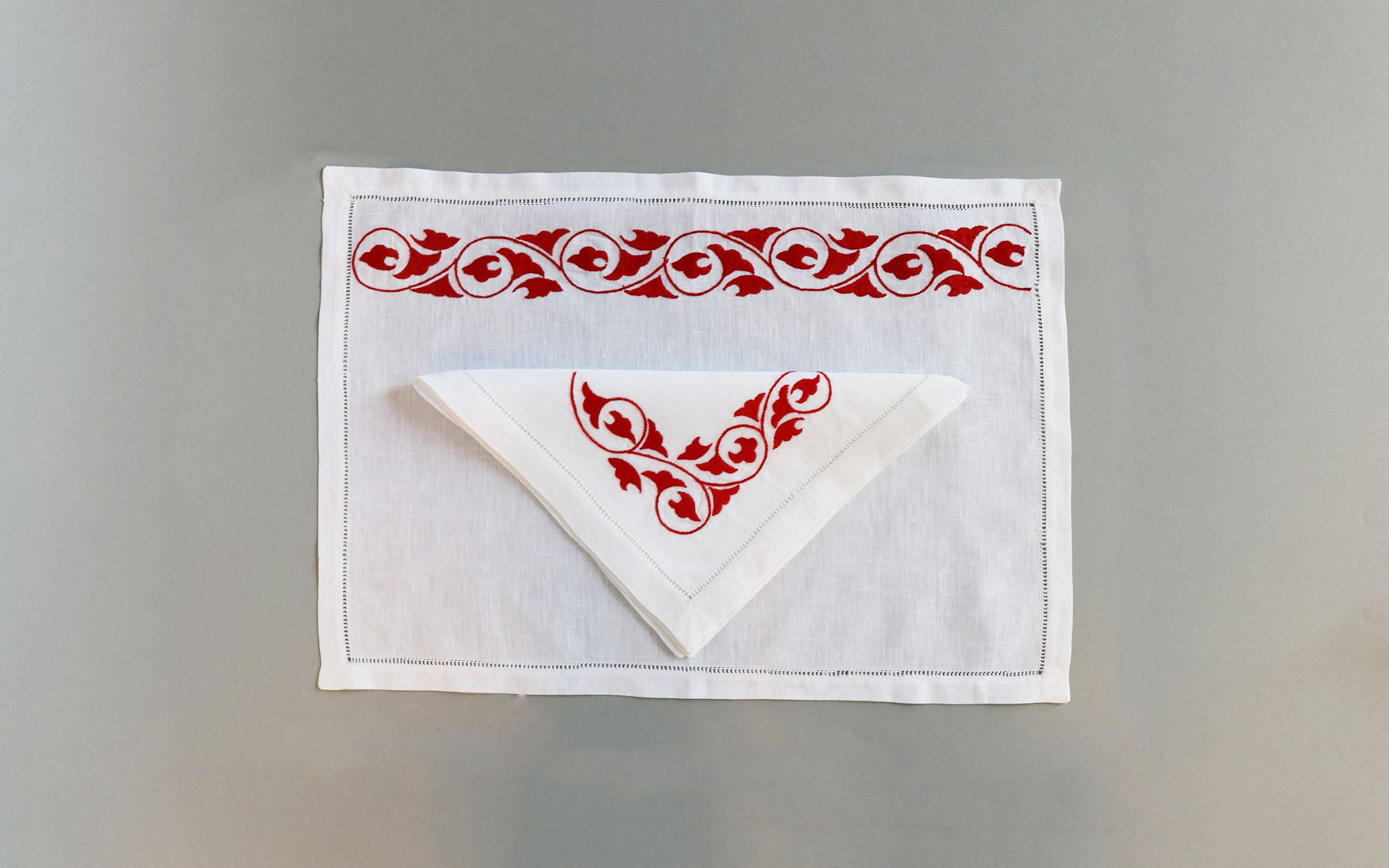 A beautiful K5 linen placemat & napkin set is delicately embroidered with flower design on high-quality white linen fabric.