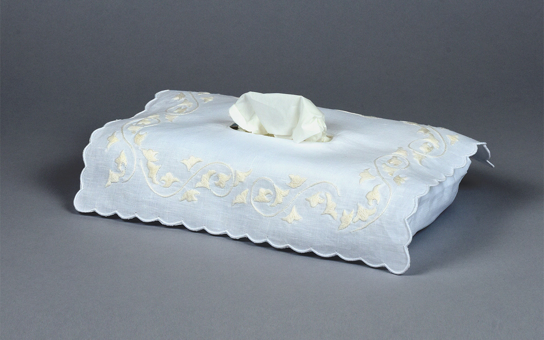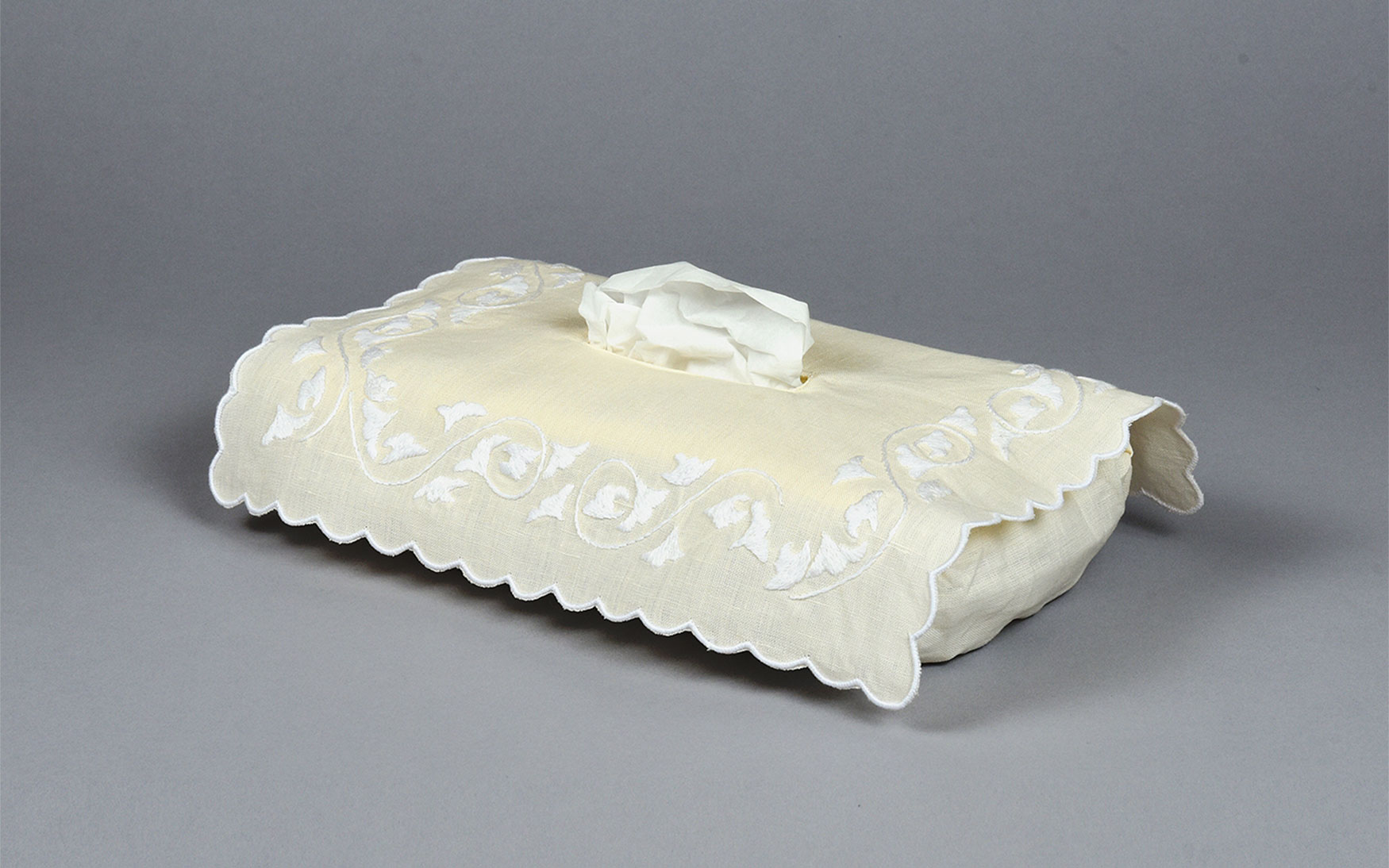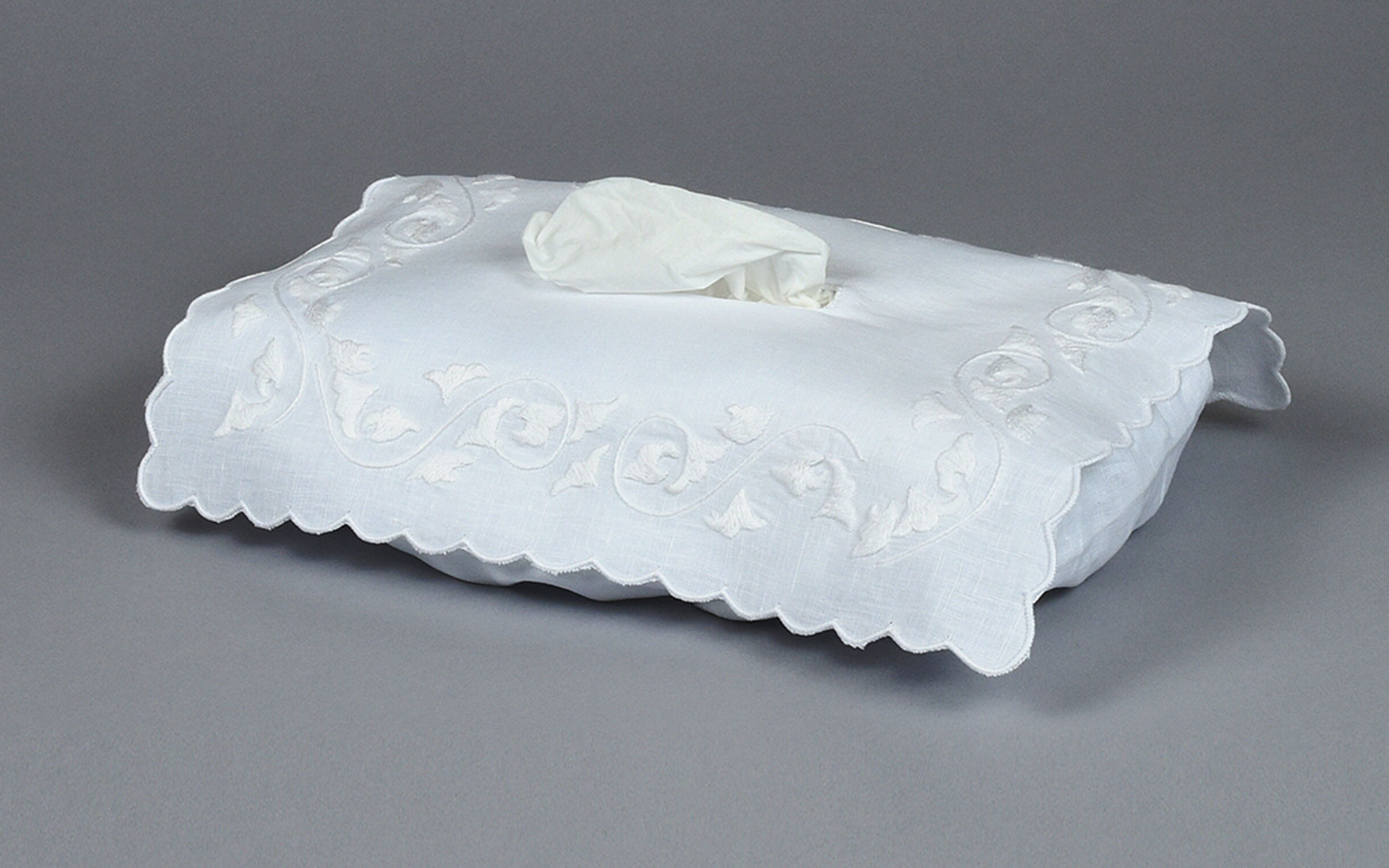 Hand embroidered 100% linen rectangular tissue covers, available in 3 colors.