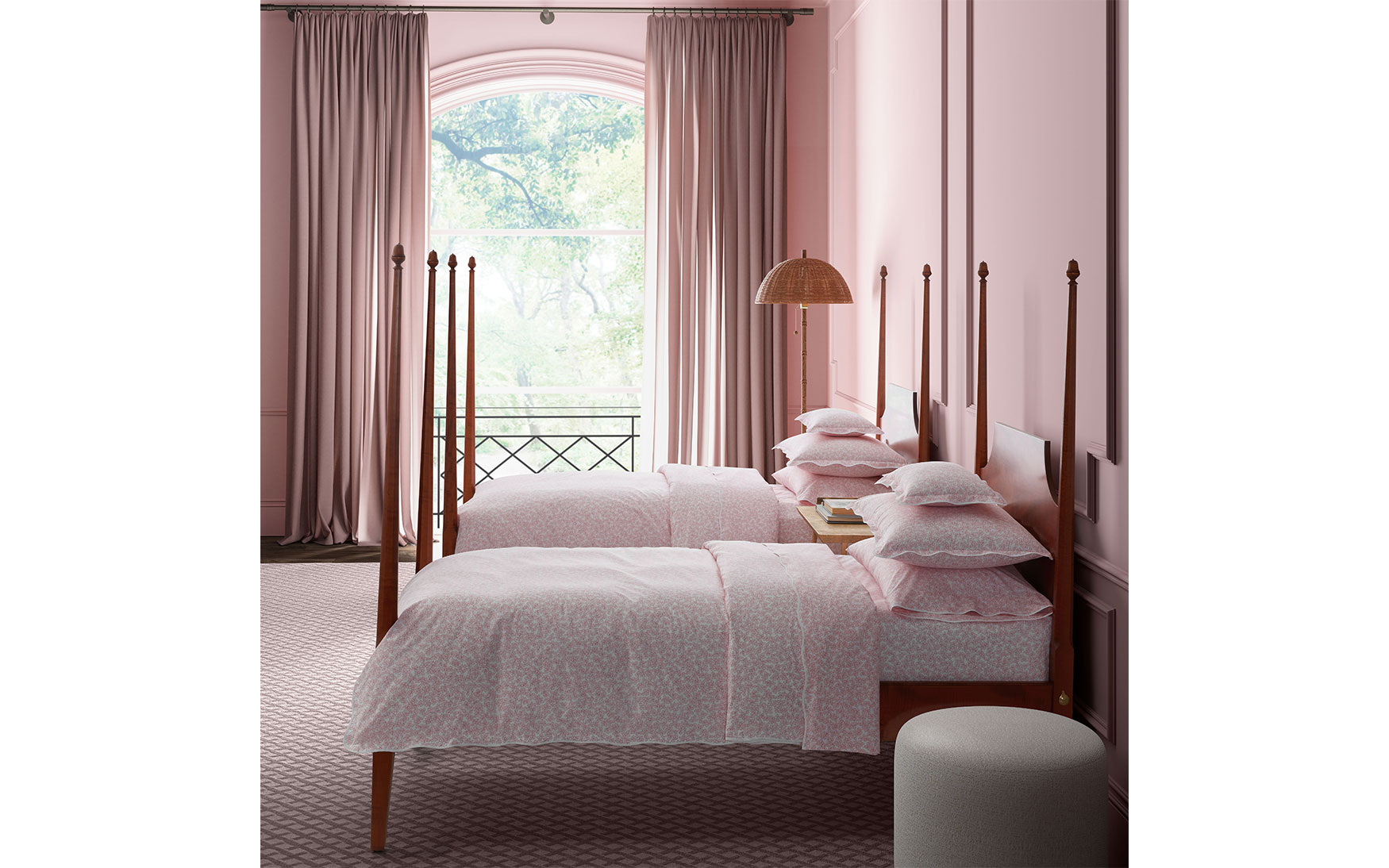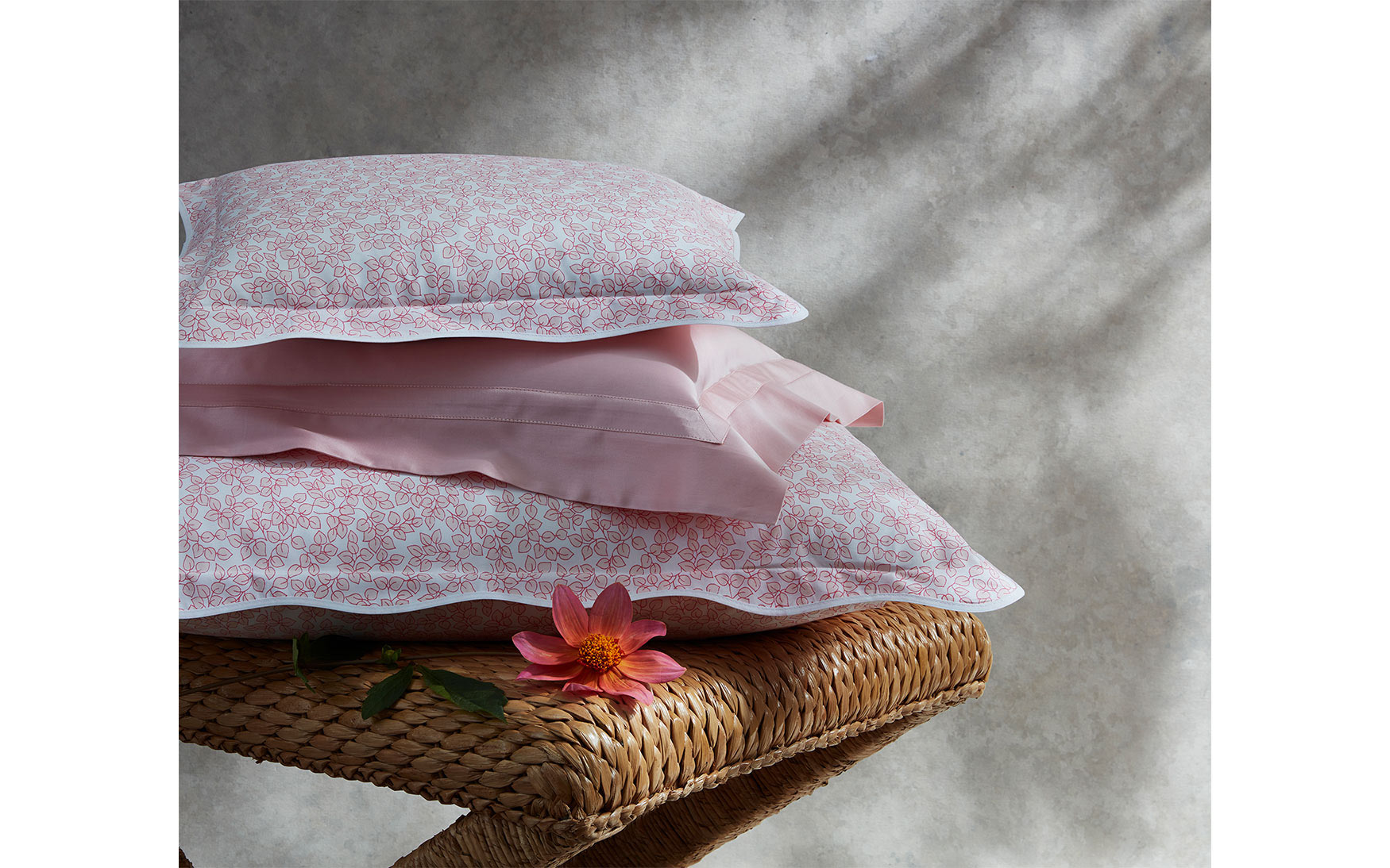 This sophisticated print is a true Matouk original, inspired by a textile found deep in our treasured archives. Margot's small, simply drawn leaves fit snugly together on our 500 thread count Luca Egyptian cotton percale, for a pattern that nearly reads as a solid color. The edges of each piece are finished with a subtle white scallop.