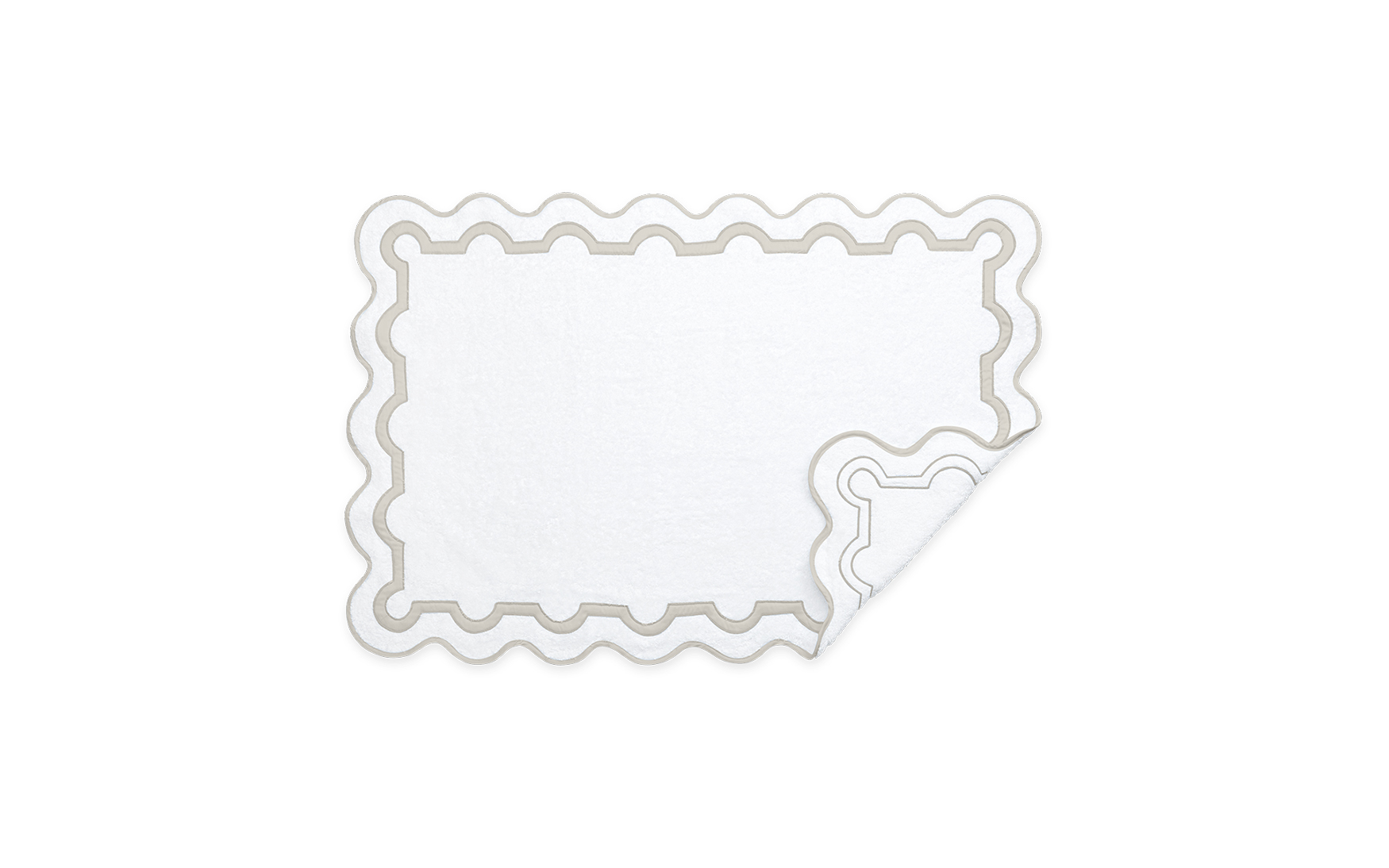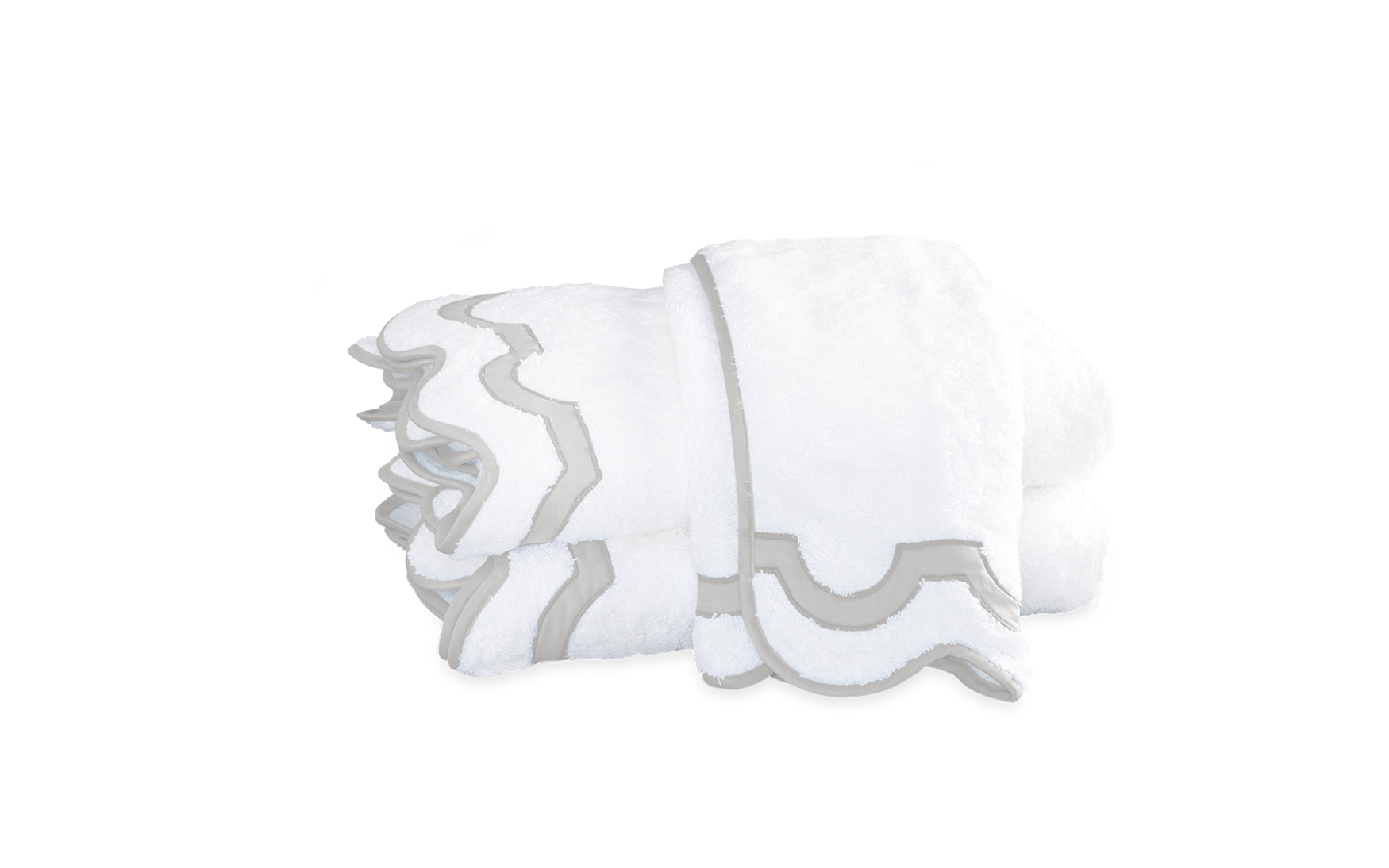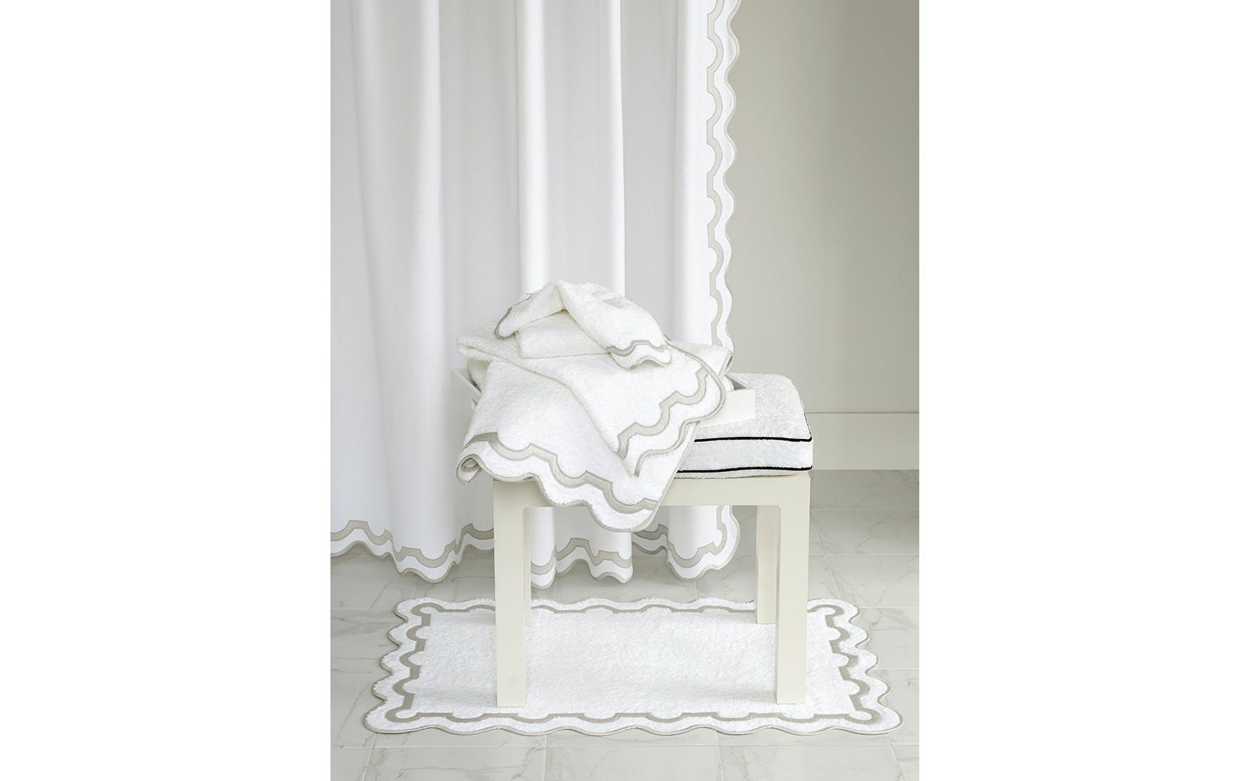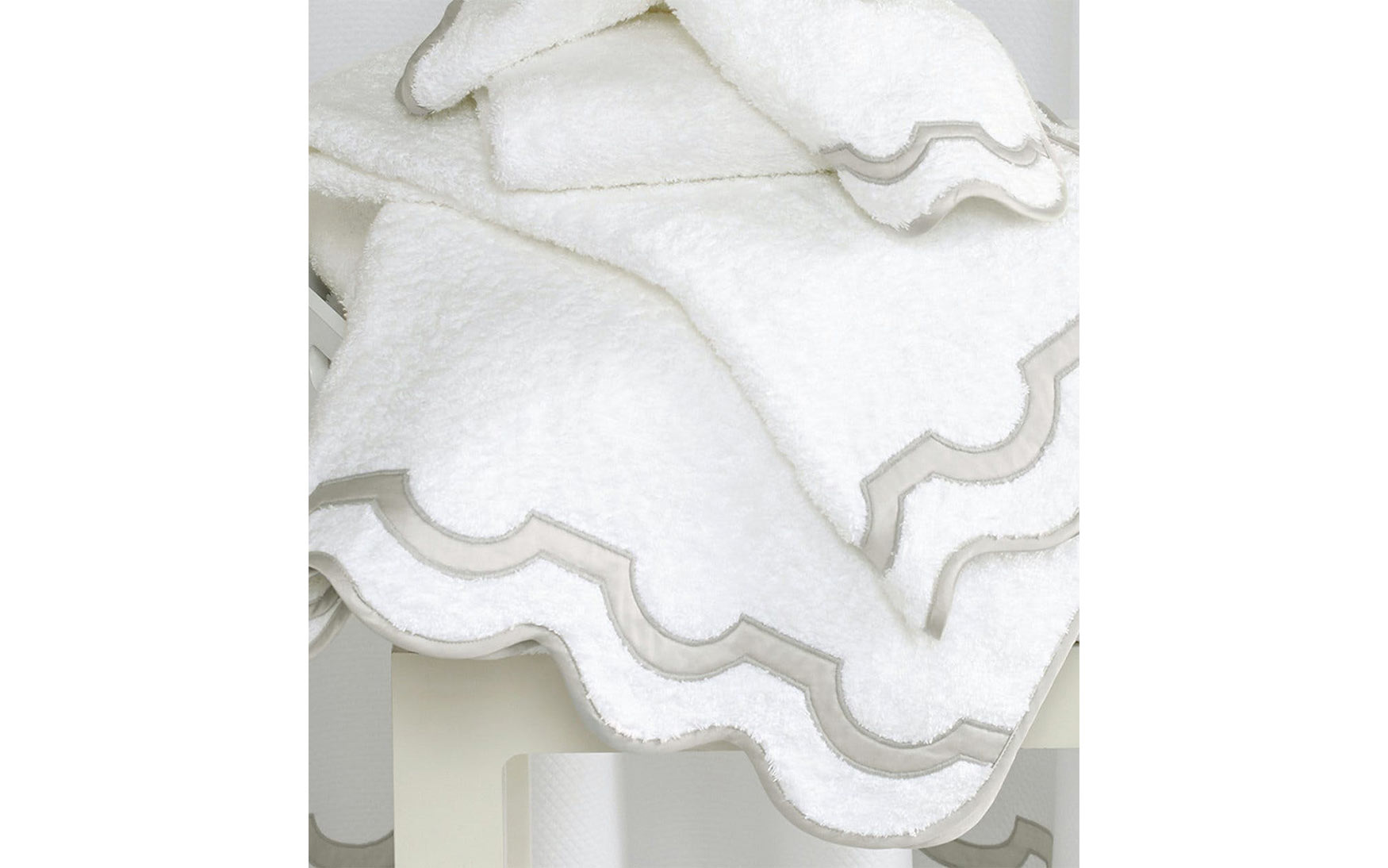 A chic shop awning in Palm Beach inspired the motif that unites our Mirasol collections. For the bath, the border is a stunning Nocturne sateen appliqué on our Cairo cotton terry towels with a scallop piping to finish.