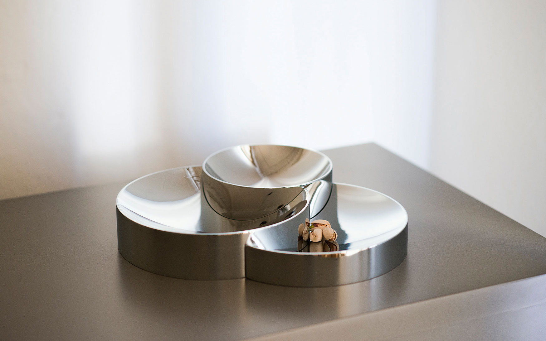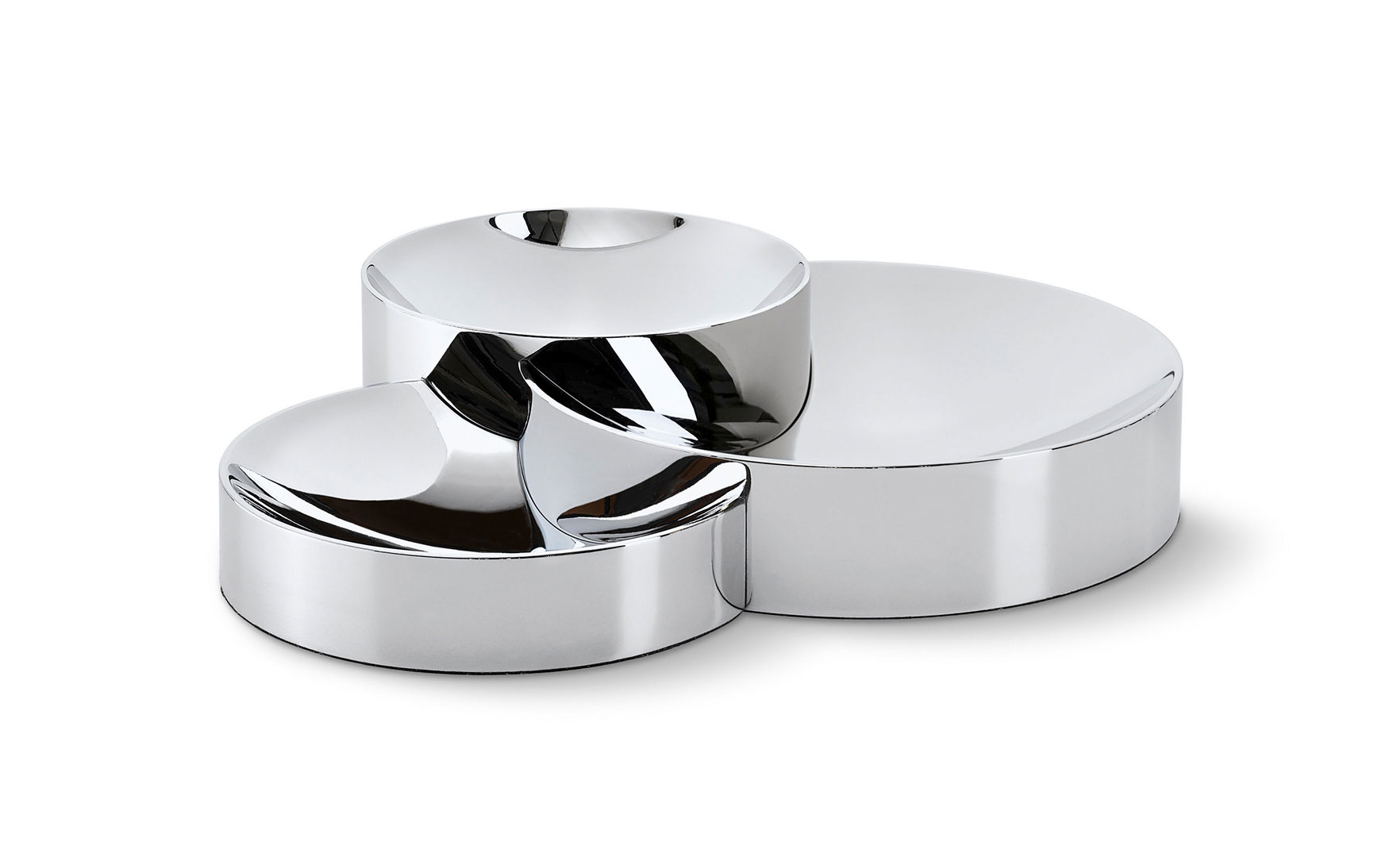 The three-piece SCALA bowl set is a coordinated ensemble and radiates in its mirror-polished Bauhaus ’ geometry - which is enjoyed by nuts, pralines and munchies. The three rounded shapes are designed to allow them to nestle into one big one. At the same time, each bowl can also master its performance solo. Placed together, the trio with different diameters, shape an organic unit, so beautiful you’ ll barely want to take them apart.