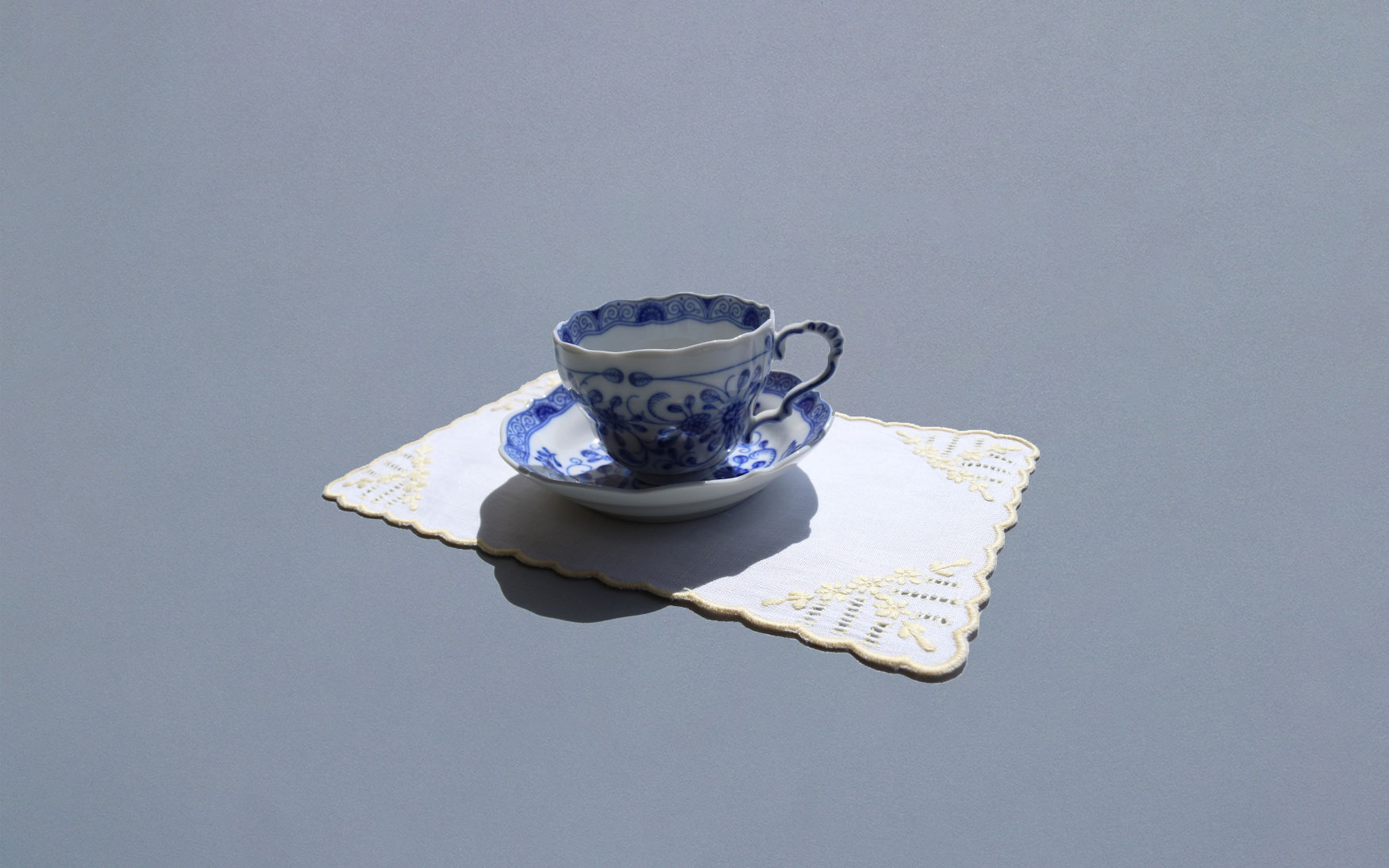Hand embroidered light yellow color flowers with ajour design on white linen and four side yellow scalloped edging.