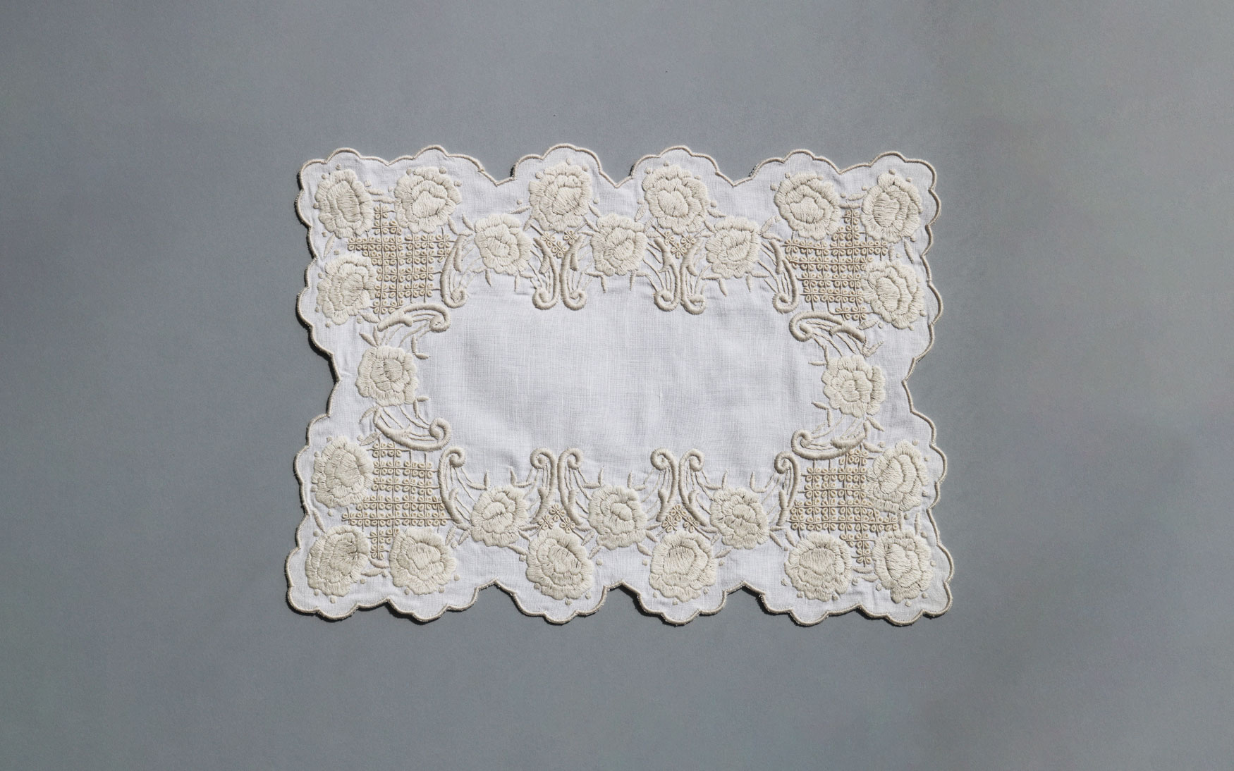 A beautiful vintage style linen tray mat with scalloped edges.