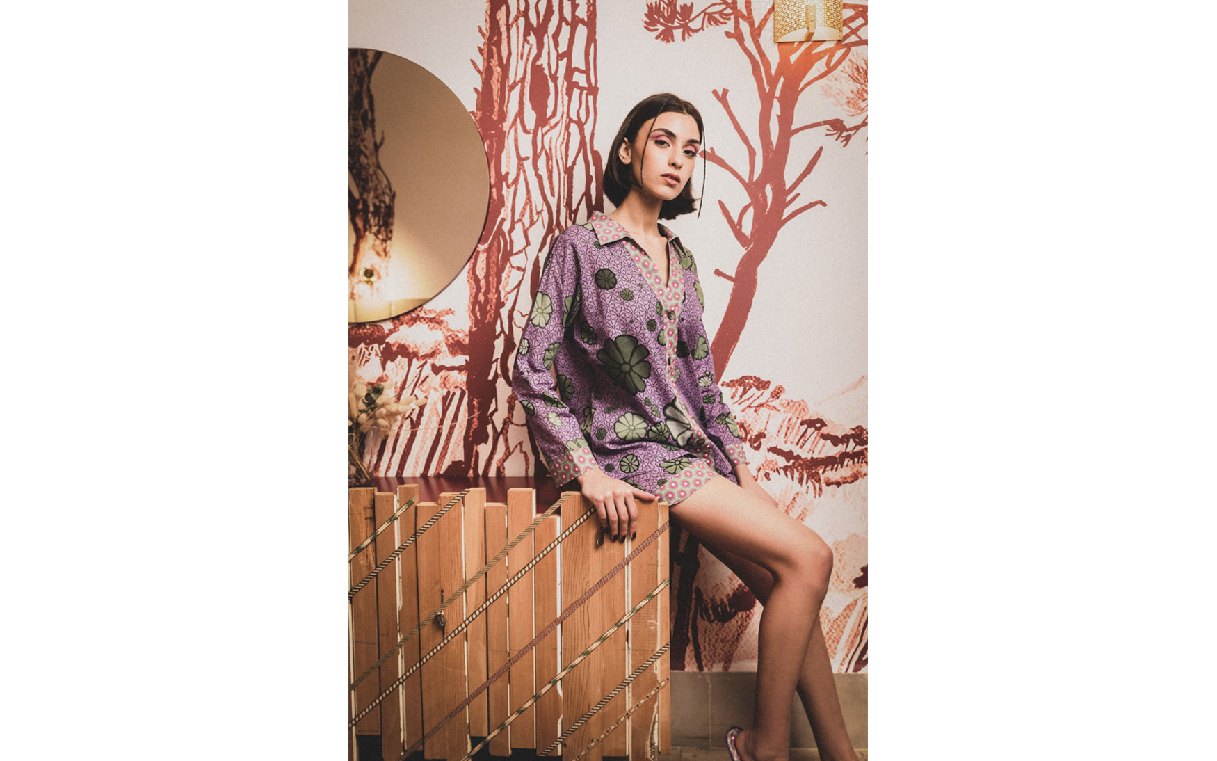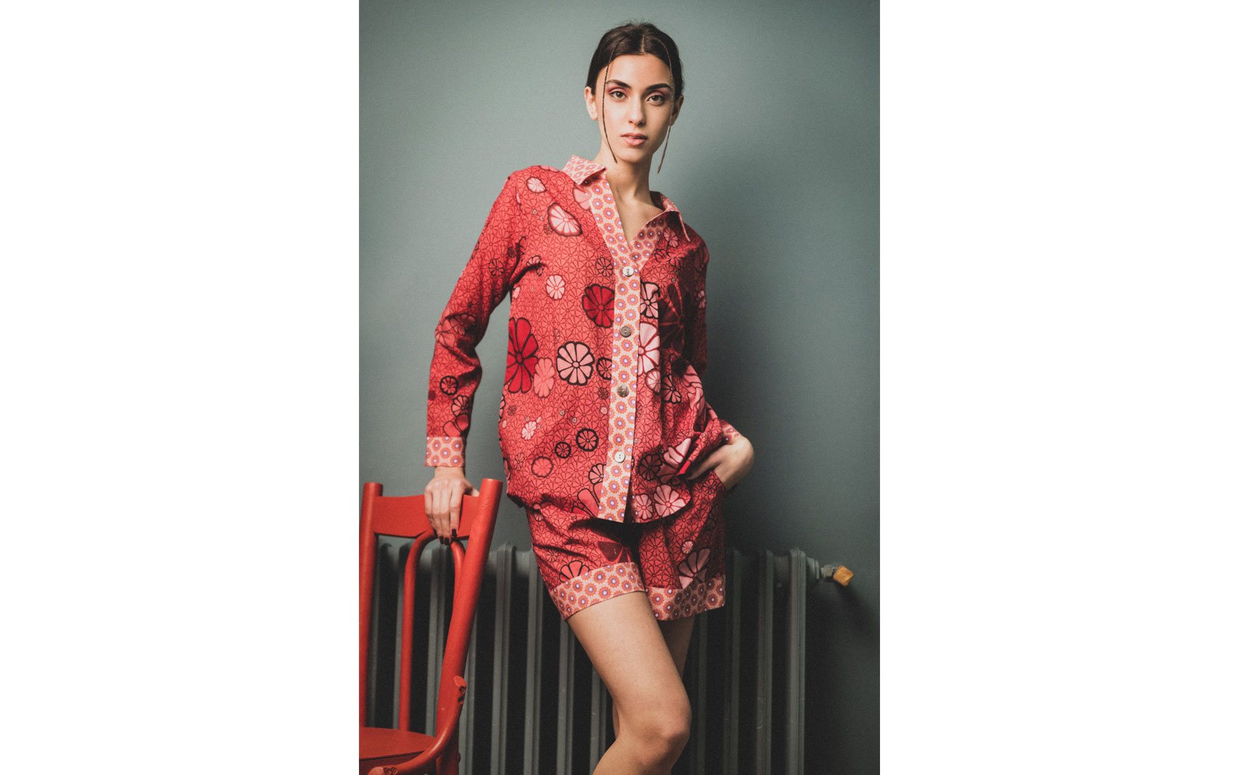 The yoyosi set is stylishly screen printed in pure cotton, finished with pearl color buttons and contrasted trims.